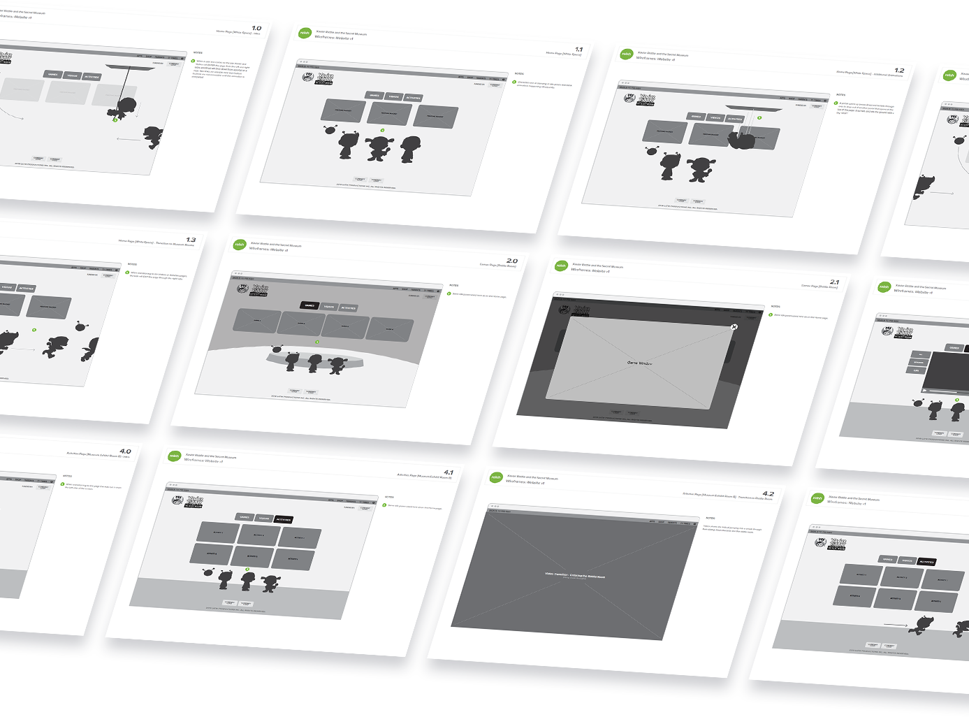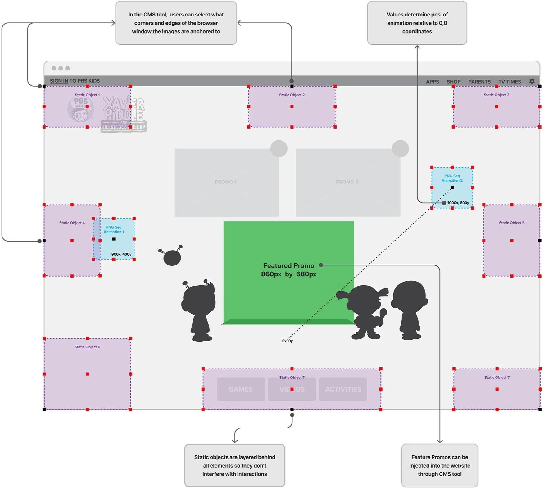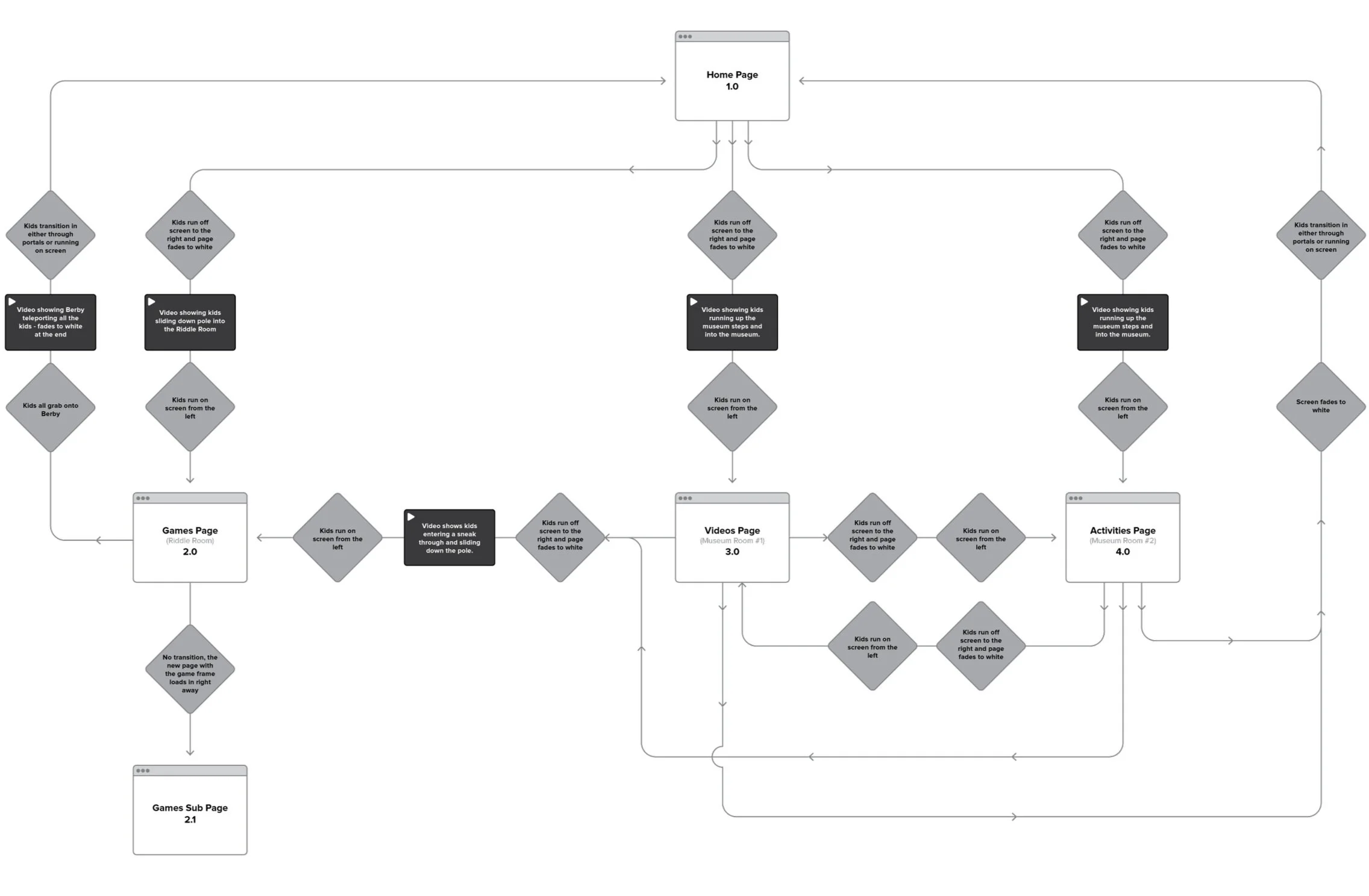 I focused on balancing functionality with fun. Working within the PBS Kids framework, ensuring easy navigation while adding interactive elements that captured the spirit of the show. I tested transitions, mapped out key interactions, left room for character voice over and easter egg animations. All while providing our developers with a clear, easy to read blueprint to work from.