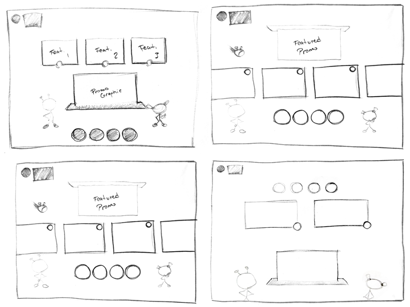 To ensure we explored every possible concept for the homepage, multiple layout options were sketched out, all designed to fit seamlessly within the PBS Kids website framework. This allowed us to find the perfect balance between between essential features and the fun stuff.